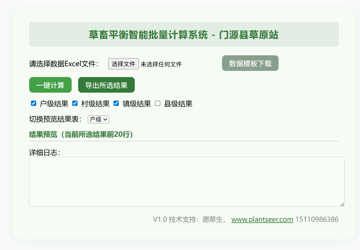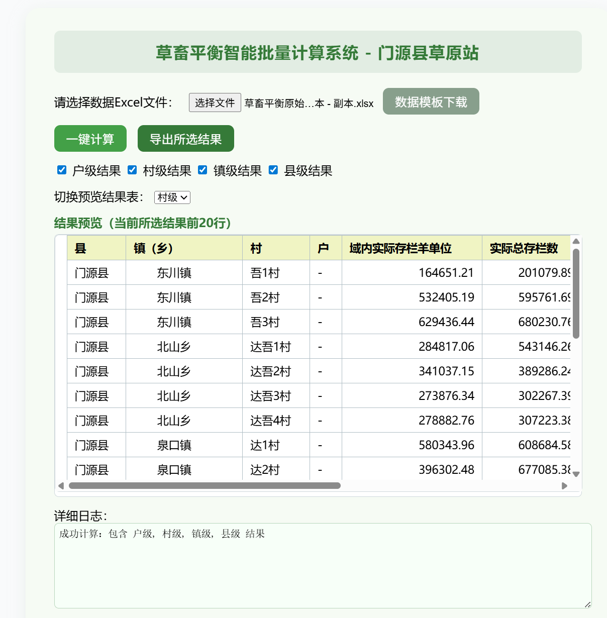 本软件为草畜平衡智能批量计算系统,专为牧区草原草畜平衡管理设计。用户只需准备好标准格式的Excel数据表,软件可自动批量计算户级、村级、镇级、县级等多层次的草畜平衡结果,并可导出全部或部分计算结果。