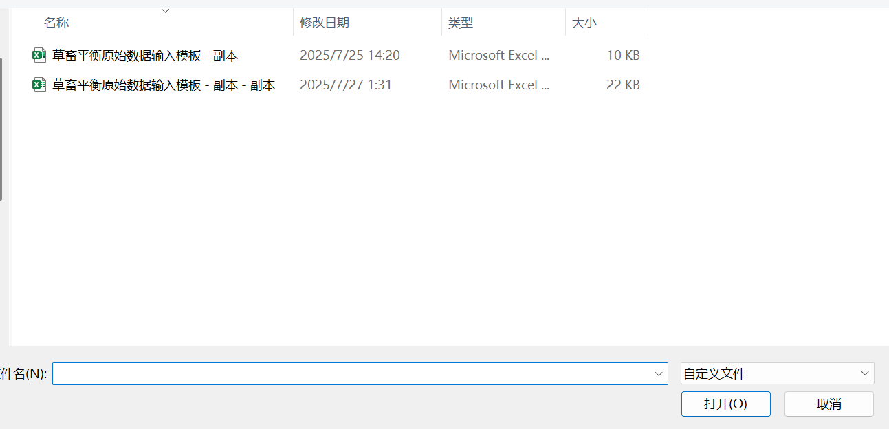 使用系统自带的标准模板(草畜平衡原始数据输入模板.xlsx,在“模板”目录下),按照表头填写您的实际数据,保存为Excel文件(建议另存为一个新文件,避免覆盖模板)。
